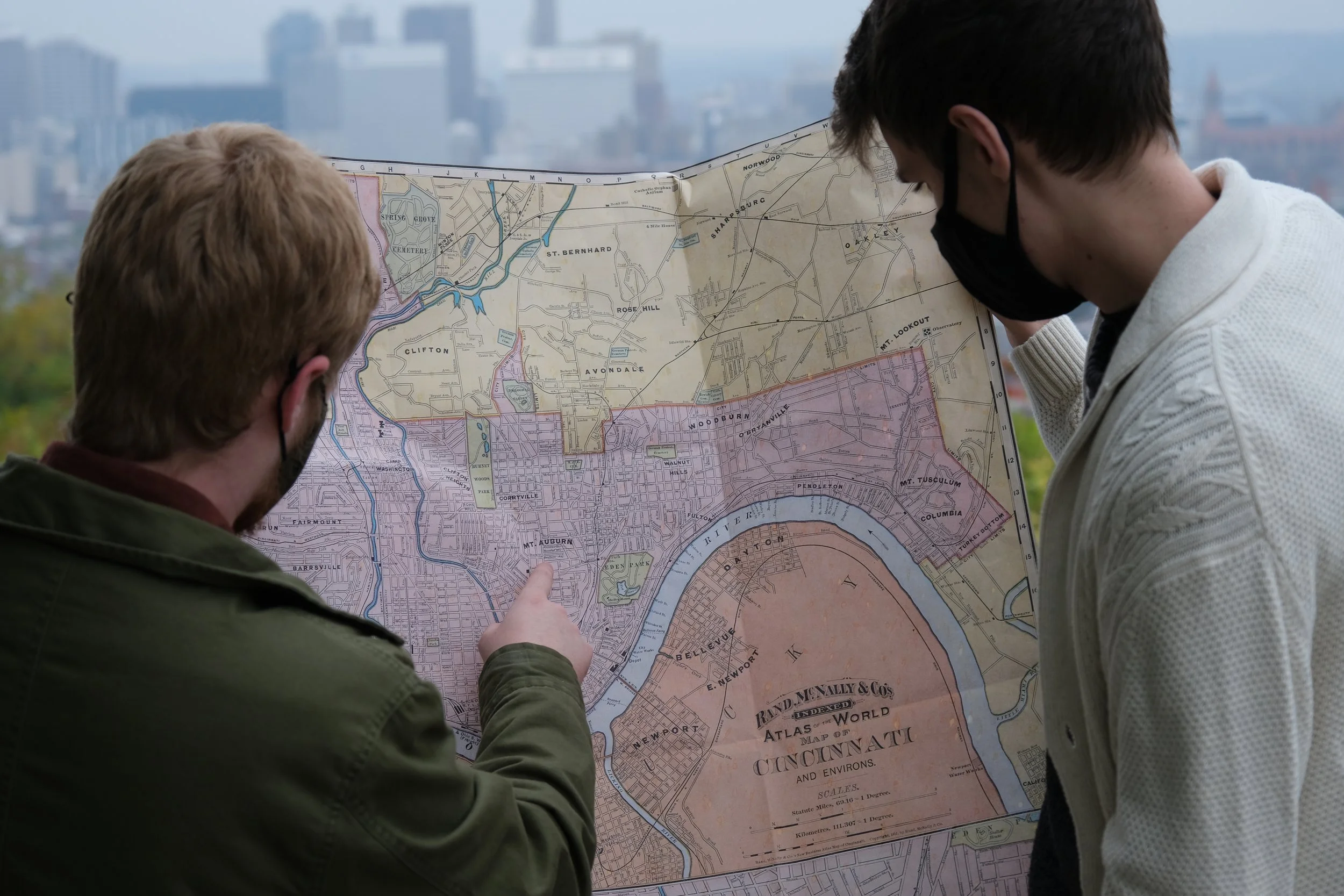 The idea was to create an immersive experience for individuals and families to enjoy while remaining socially distanced. In order to achieve this, I came up with a hybrid model of virtual puzzles to be solved and completed at home with clues from historic landmarks in the Cincinnati area that could be publicly accessed outdoors.